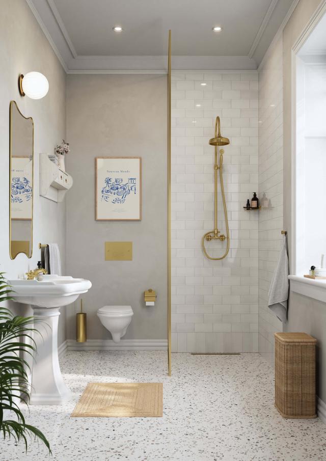 Står du overfor at skulle nyindrette et badeværelse, og ønsker du at skabe et look, der giver associationer til et klassisk badehotel? Så kan du gennemføre stilen ved at vælge alt fra terrazzogulv og gulvstående toilet med cisterne til piedestalhåndvask og to-grebs armatur og -brusesæt.