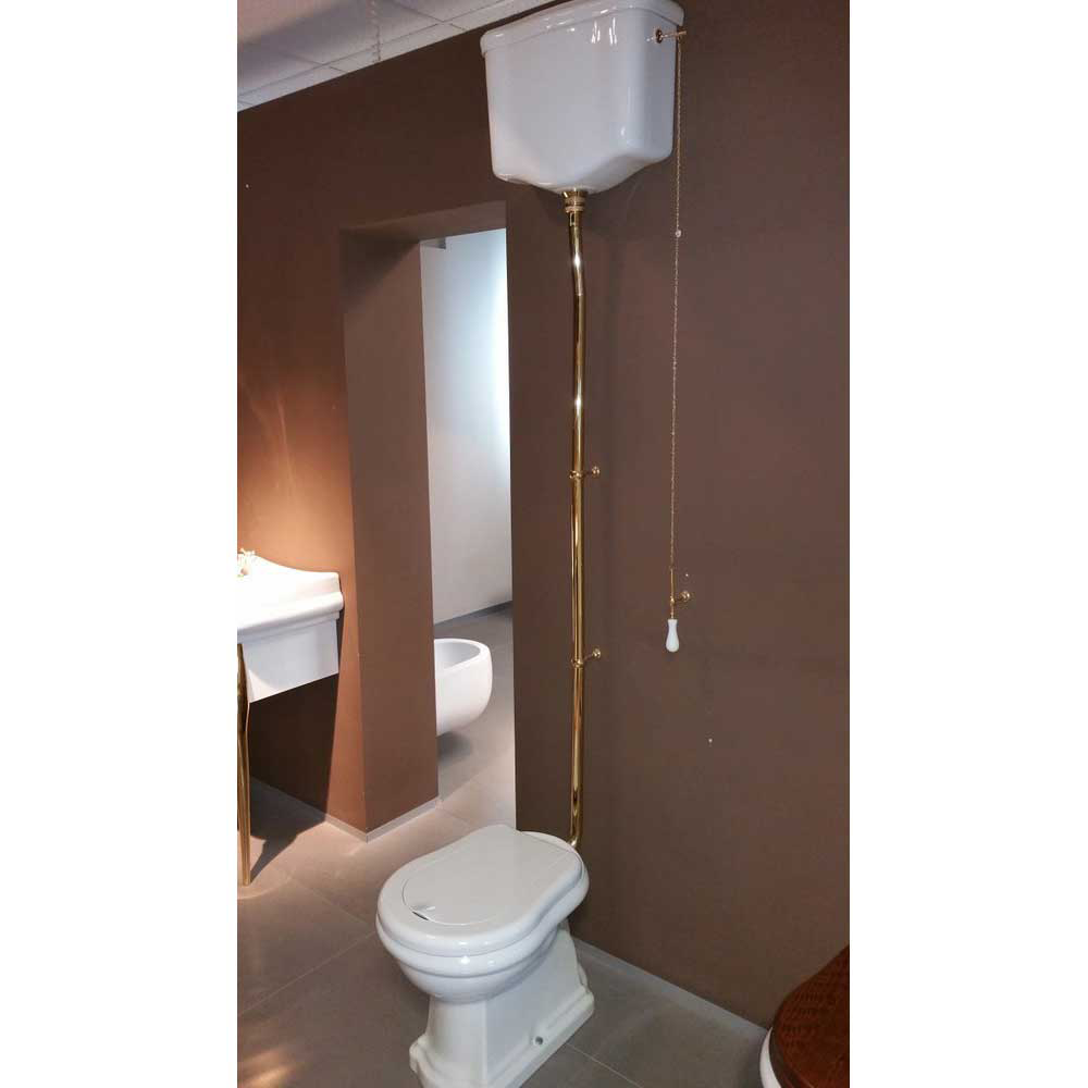 Det er en original badeværelsesløsning, der perfekt kombinerer vintage og klassisk stil med et moderne tilsnit. Den lange træk-og-slip kæde, der falder lodret fra den ene side af cisternen, er en gammeldags, men essentiel detalje, der fuldender dette traditionelle toilet på højt niveau. Snonen kan monteres på enten højre eller venstre side af cisternen.