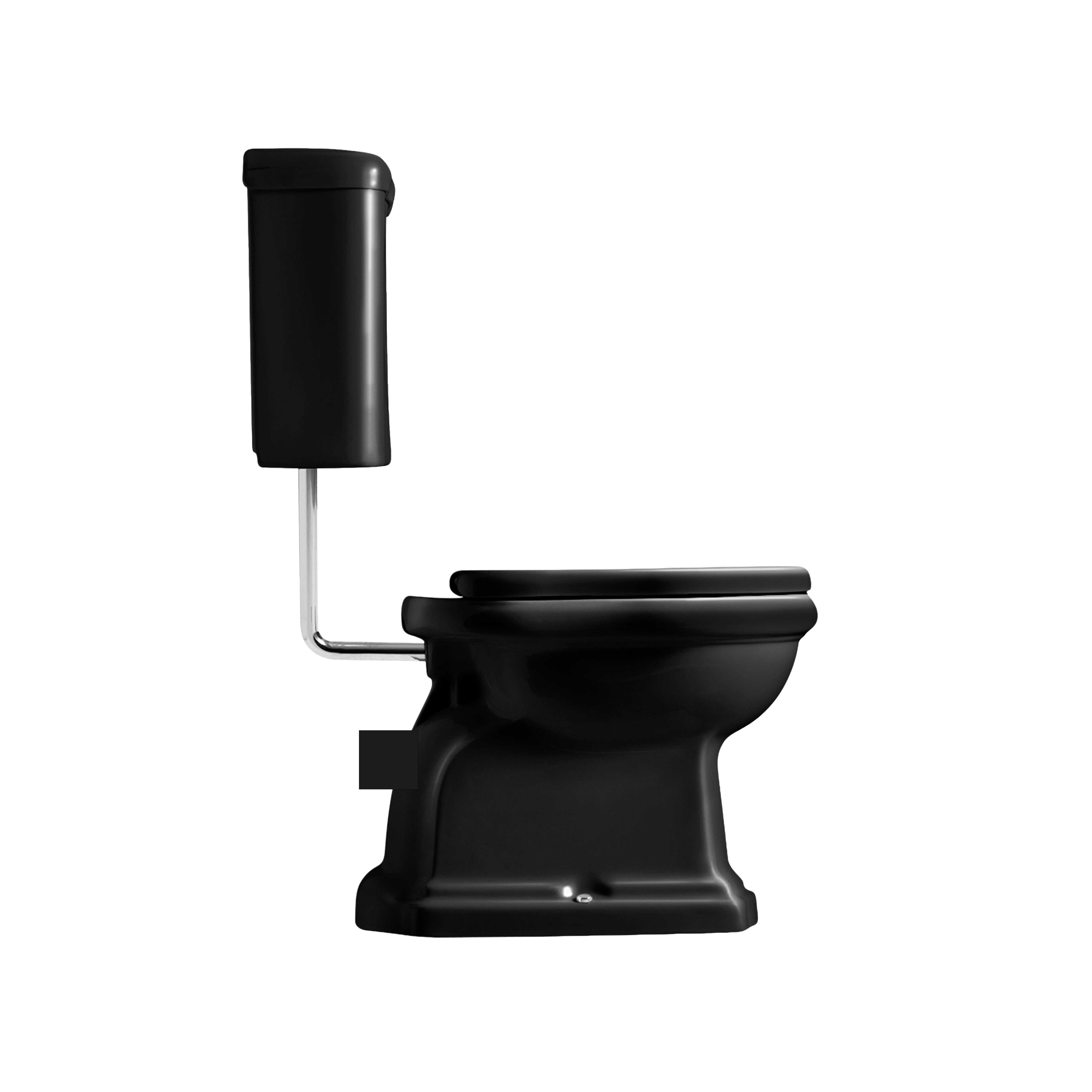 Retro-toilet med lavt placeret cisterne med ét skyl er et raffineret og unikt toilet, der vil forstærke dit badeværelse med skønhed og vil gøre det til et sted, der er ud over det sædvanlige. Den lavt monterede cisterne, som er afgørende for et effektiv skyl, ændrer badeværelsets klassiske stil til et ekstraordinært og trendy retro område. Cisternes placering er ideal hvor der er pladsproblemer f.eks. i badeværelser med lavt til loftet, er lavt monteret cisterne den mest praktiske og komfortable løsning.
