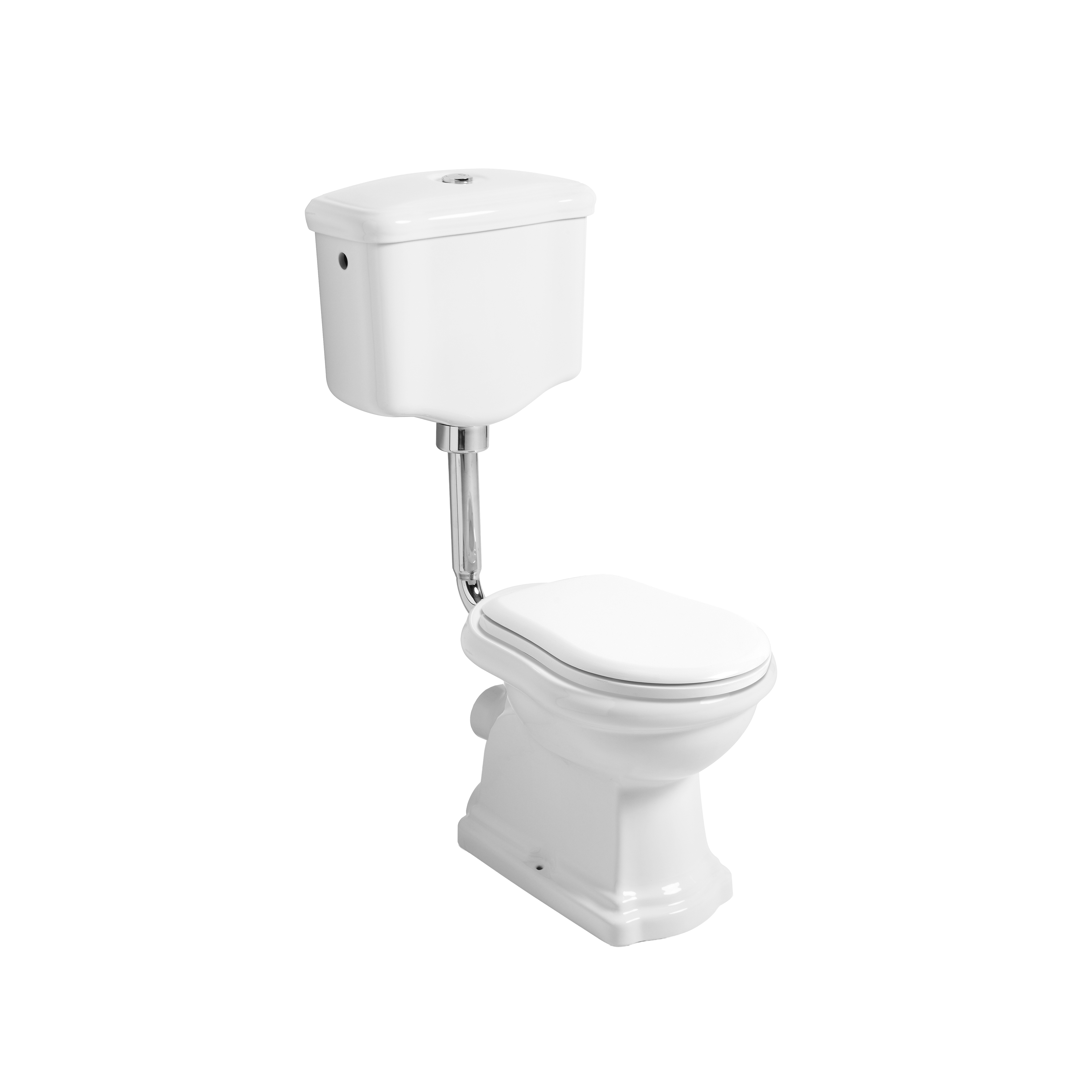 Retro-toilet med lavt placeret cisterne med ét skyl er et raffineret og unikt toilet, der vil forstærke dit badeværelse med skønhed og vil gøre det til et sted, der er ud over det sædvanlige. Den lavt monterede cisterne, som er afgørende for et effektiv skyl, ændrer badeværelsets klassiske stil til et ekstraordinært og trendy retro område. Cisternes placering er ideal hvor der er pladsproblemer f.eks. i badeværelser med lavt til loftet, er lavt monteret cisterne den mest praktiske og komfortable løsning.