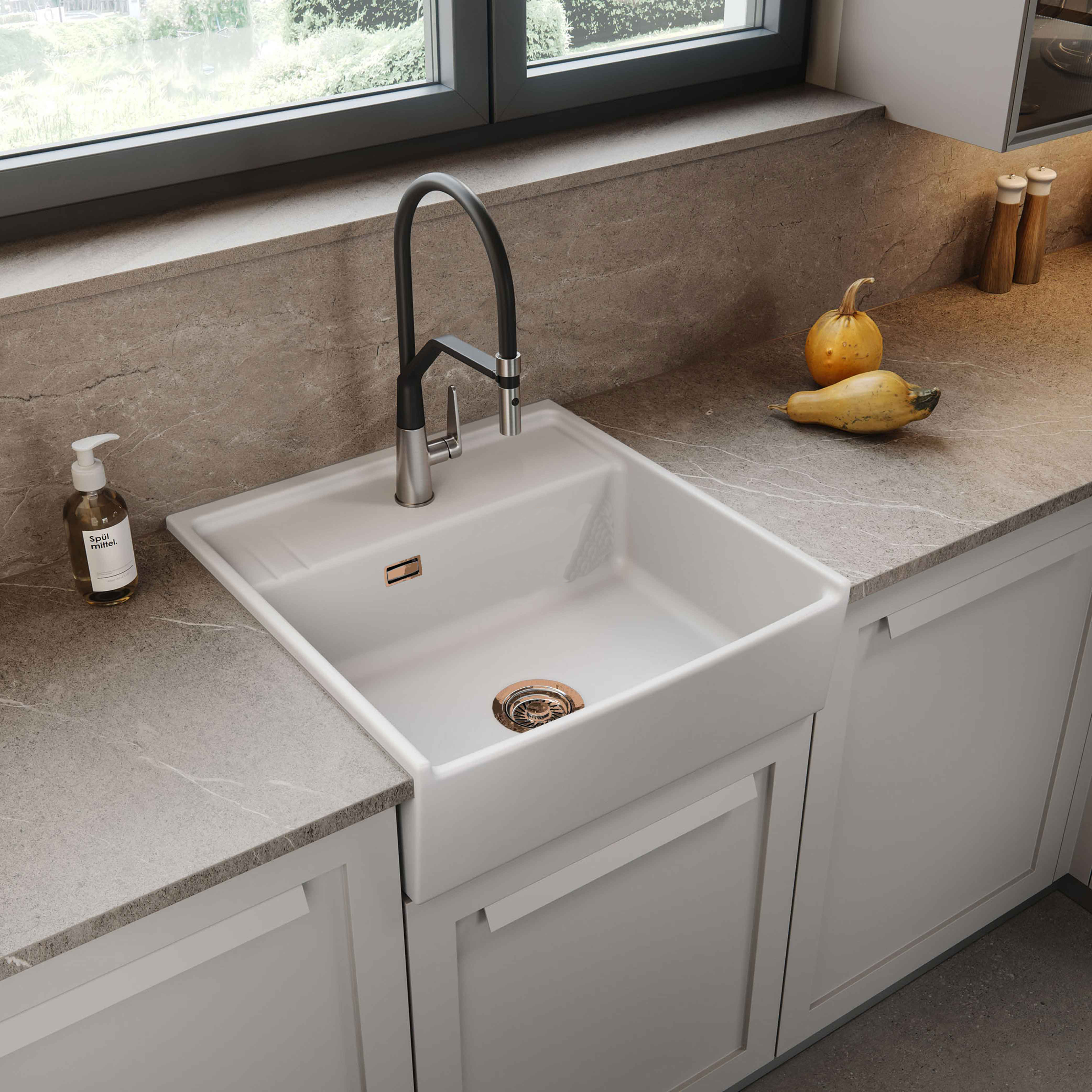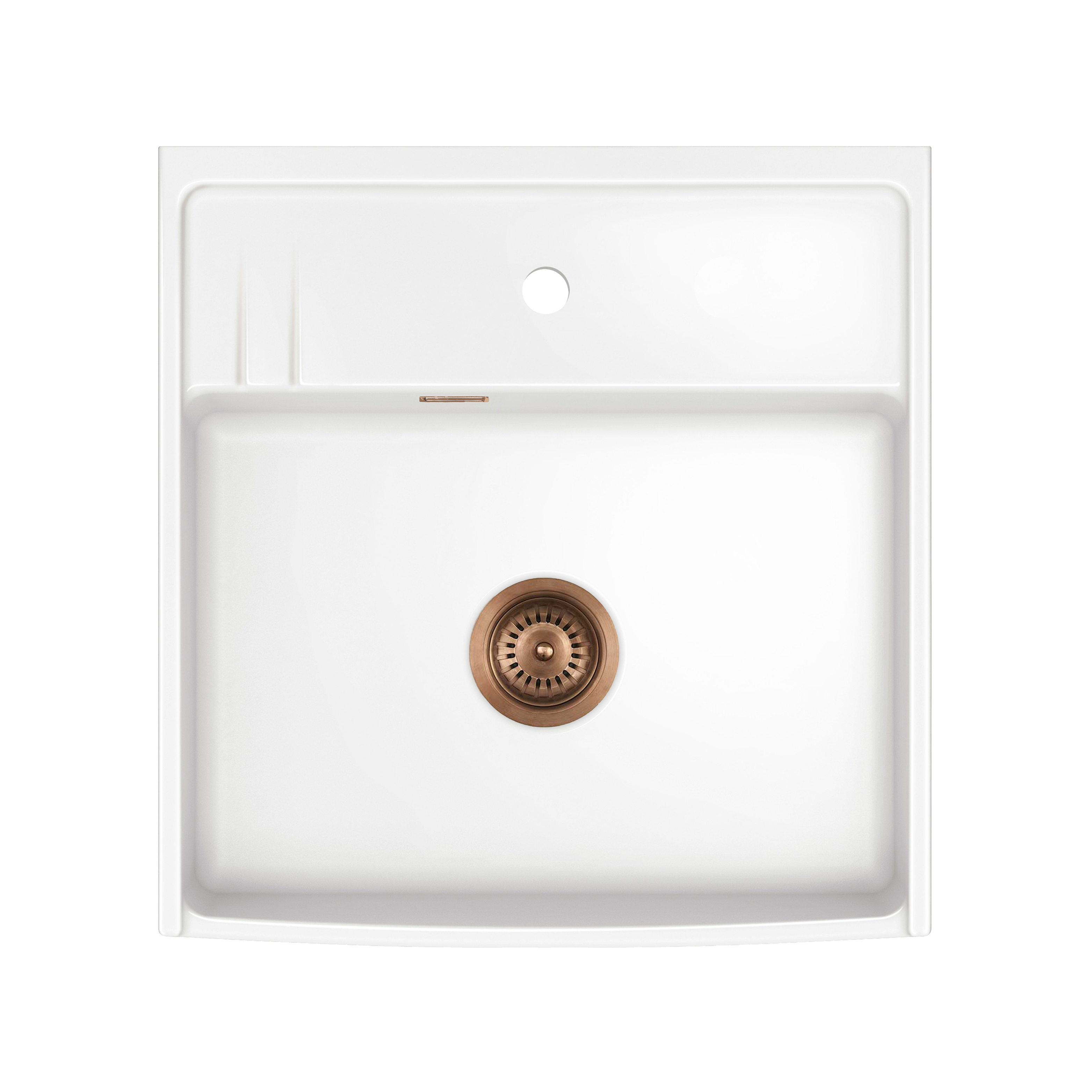 Kentro 60 keramik køkkenvask, Hvid m/PVD Kobber afløb