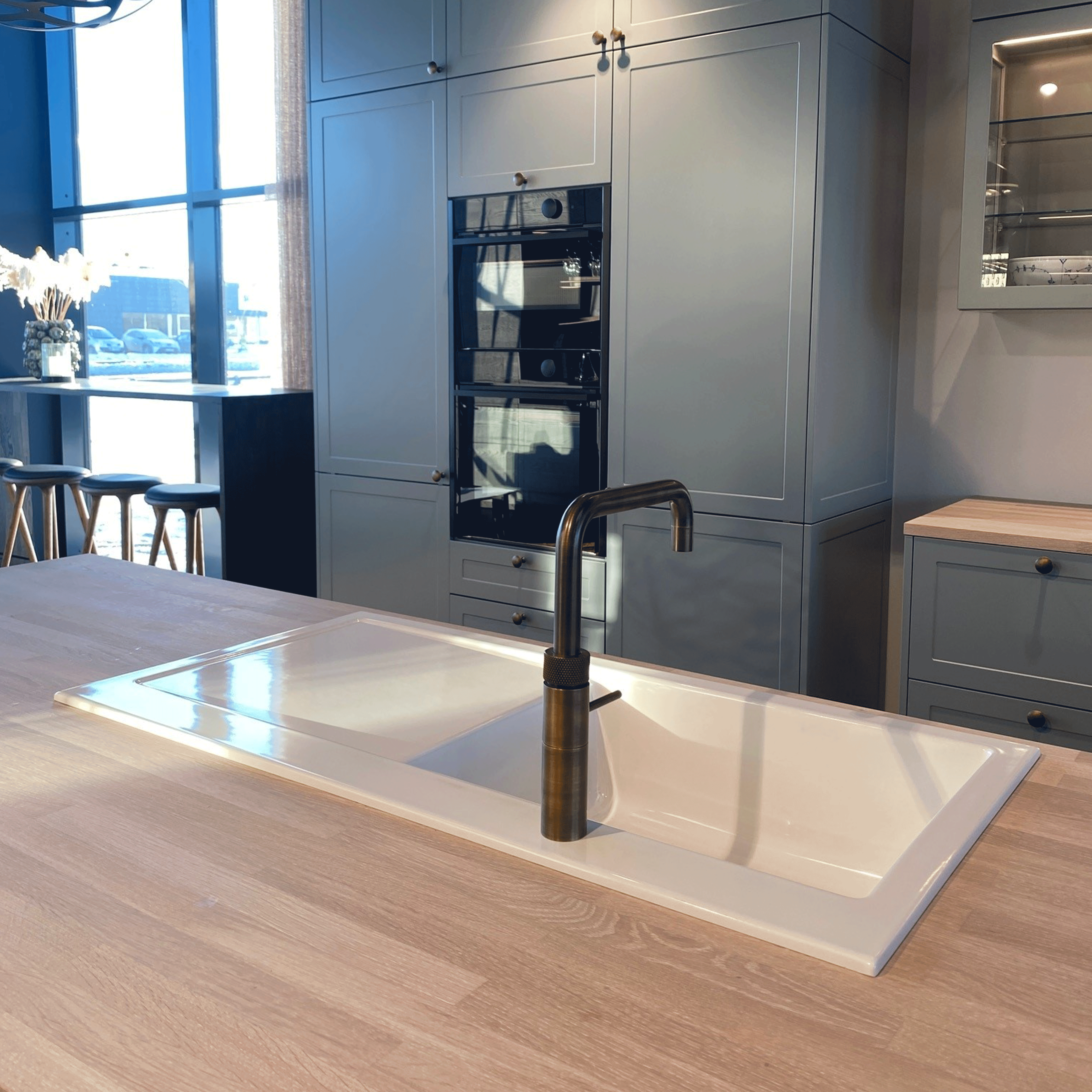 Køkkenvasken leveres med standard bundventil i PVD kobber og vandlås.