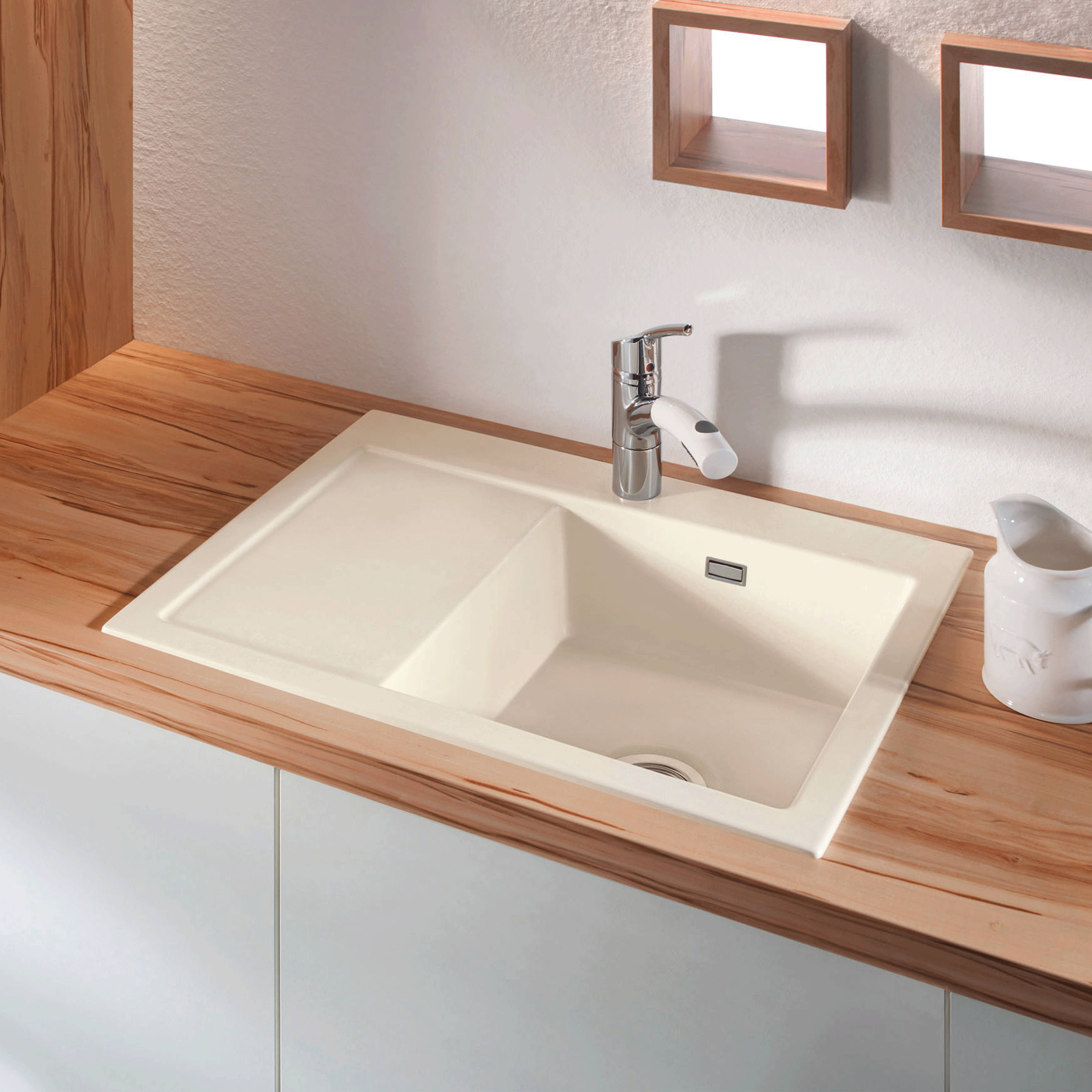 Mera 70 er en enkelkummet køkkenvask med bakke, Køkkenvasken er til almindelig nedfældning i køkkenbordpladen. Vasken er et 100% naturprodukt bestående af ler og glasur og har et enkelt og tidløst design.