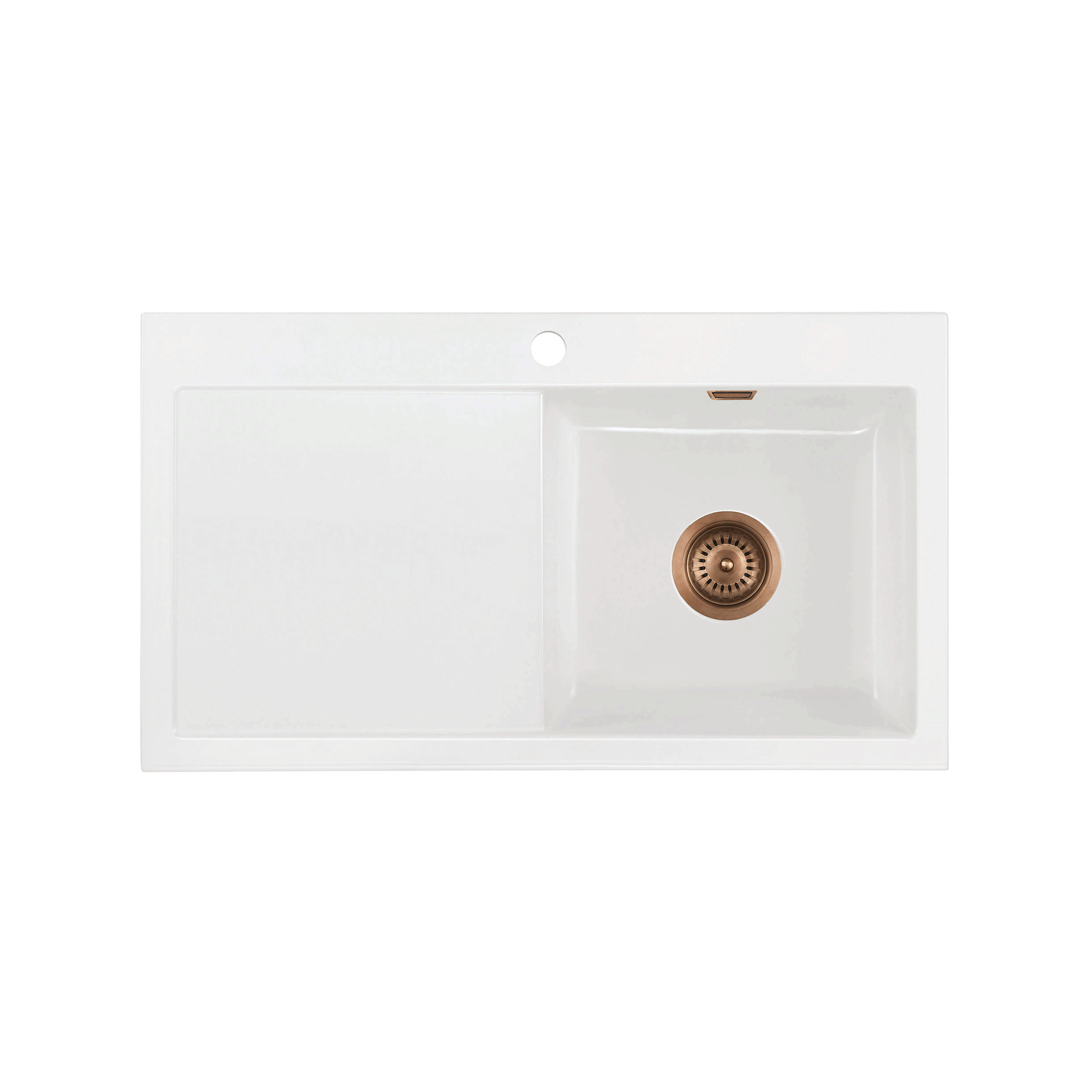 Mera 90 keramik køkkenvask m/bakke, Hvid m/kobber afløb