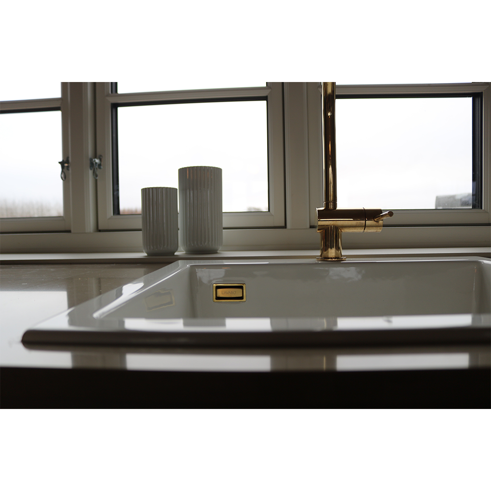 OBS: Det messing farvede firkantede overløb er i rustfrit stål med trykpåført PVD** overflade behandling i farven messing.