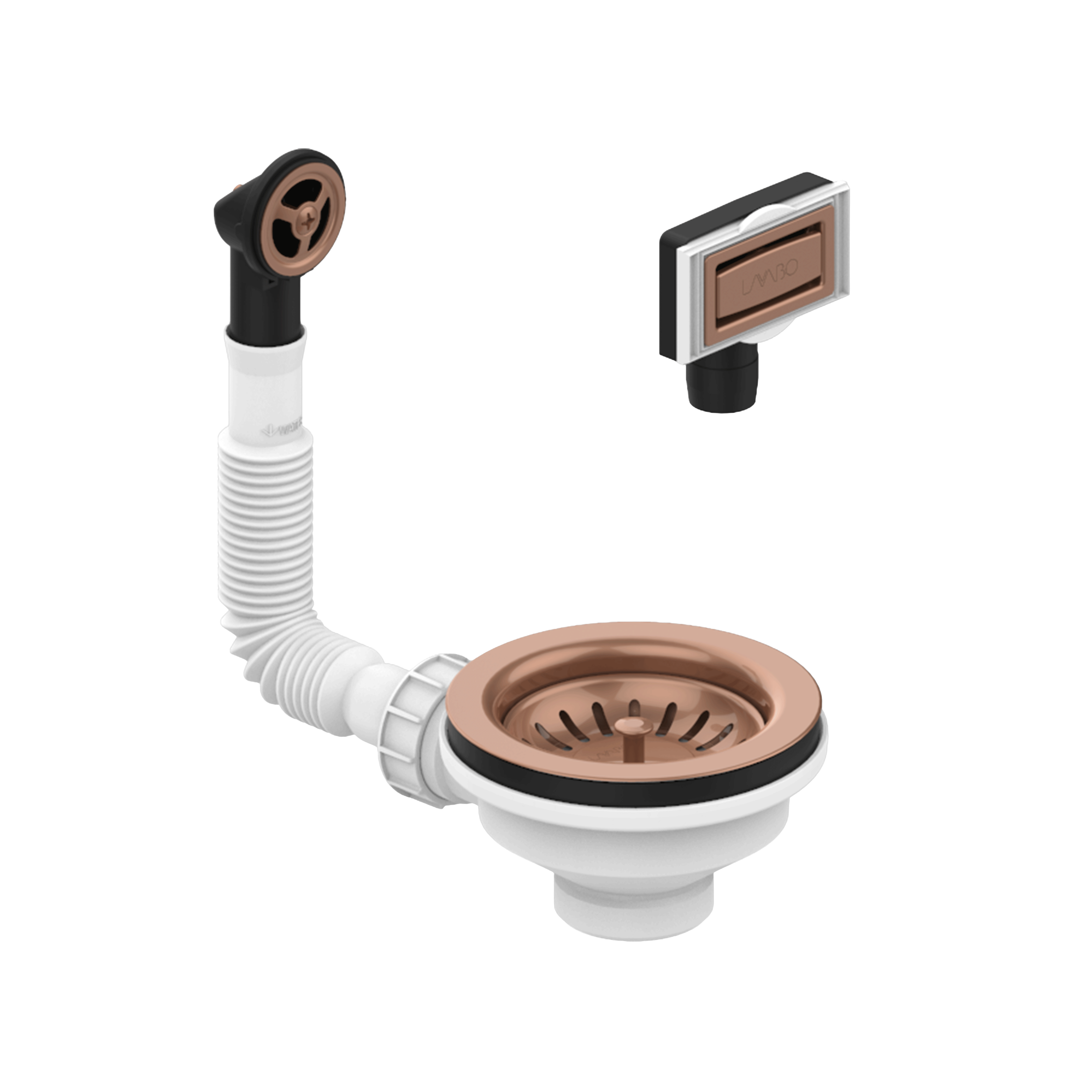 Universal bundventil med overløb i PVD* kobber. Leveres to overløb (rund og rektangulær), elegant dækplade med logo til det rektangulære overløb samt fleksibel overløbsslange.