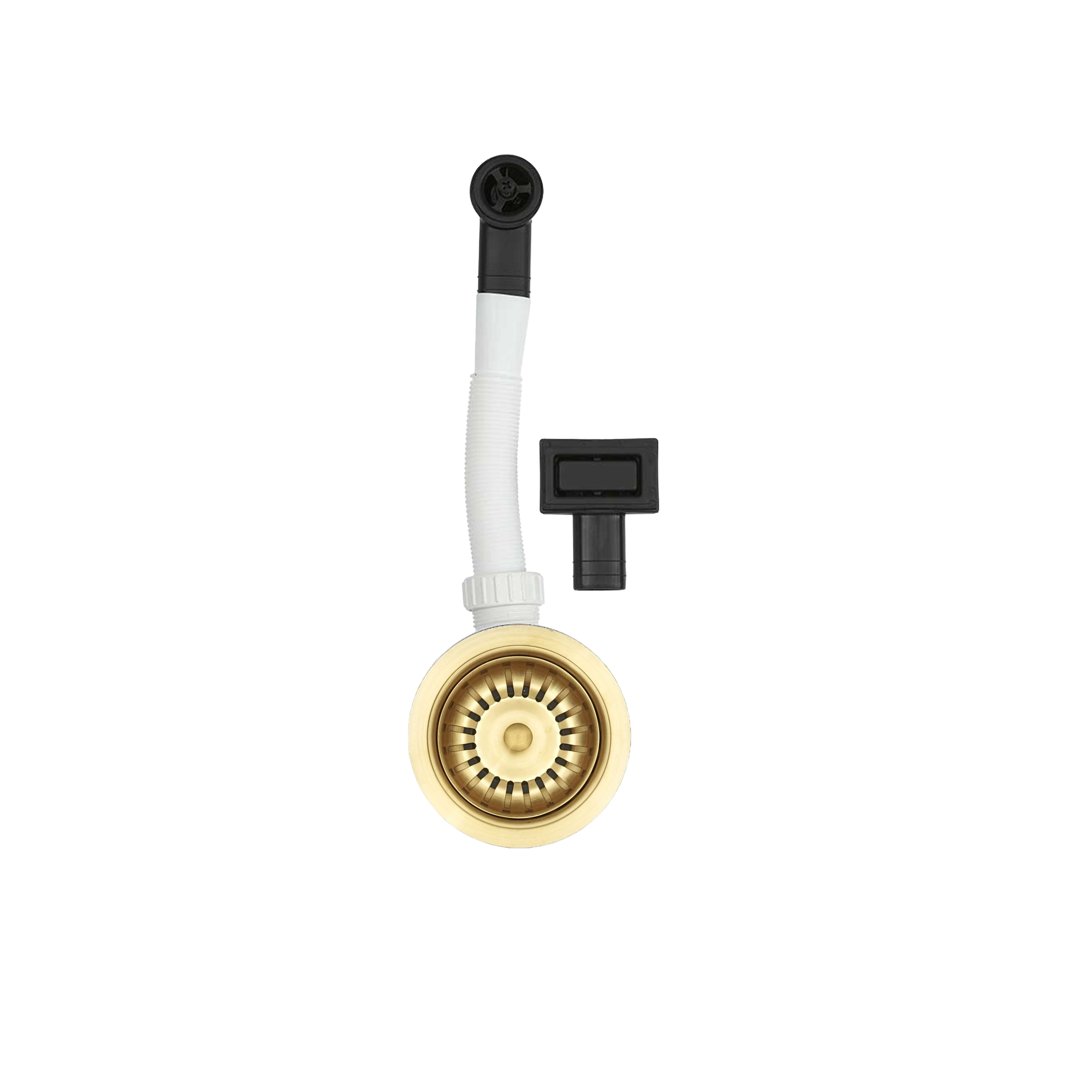 Universal bundventil med overløb i PVD sand. Leveres to overløb i sort (rund og rektangulær), elegant dækplade til det rektangulære overløb samt fleksibel overløbsslange.